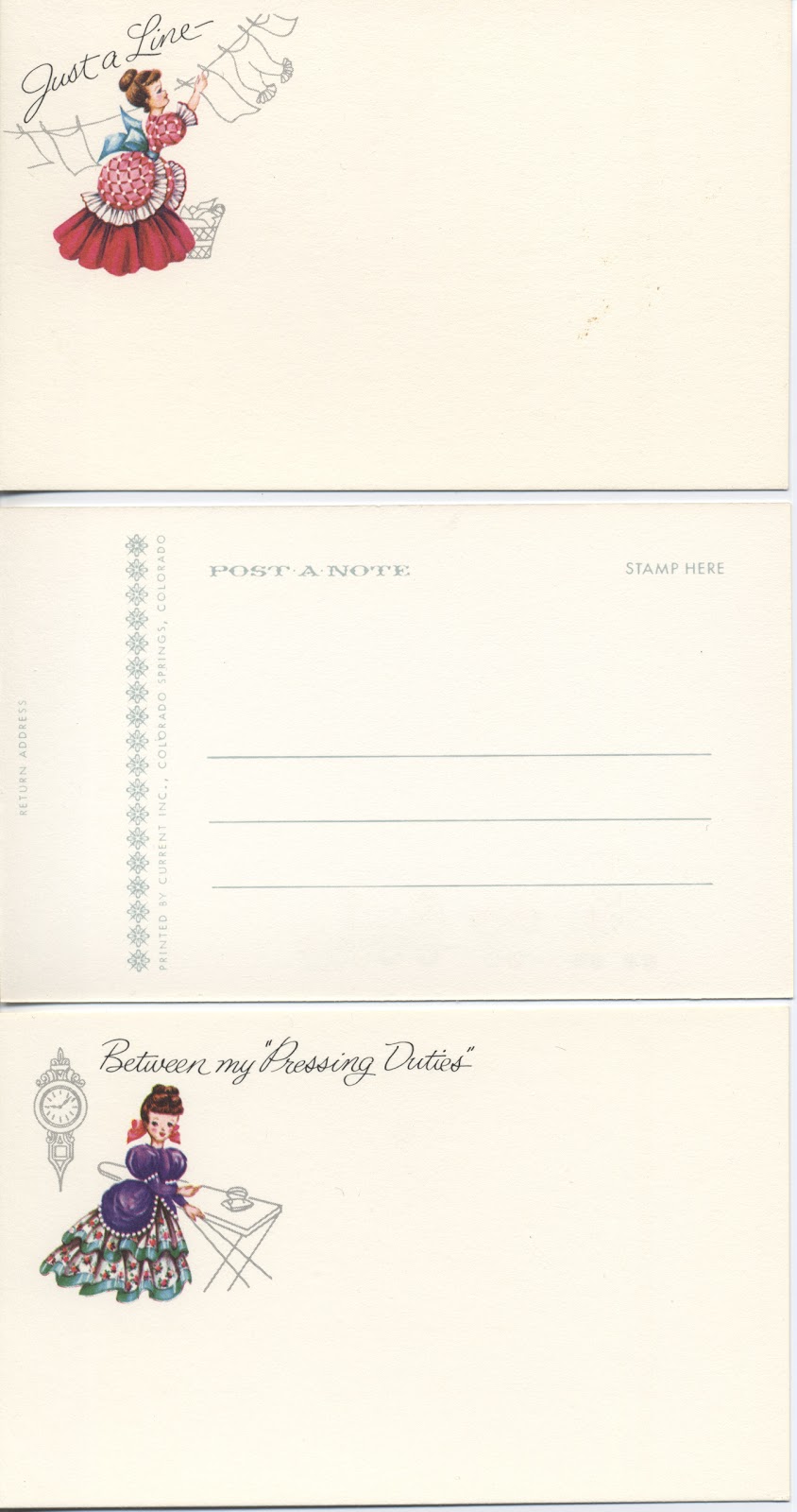 I have been finding more treasures - looking through boxes that have been stored away for years or while cleaning out the drawers of an old dresser. Post cards, note cards, greeting cards galore! Here's the first few to share, from a set of pretty note cards I found in the back of a drawer of an old desk; there are about 10 different designs, here are two, with the center one being what the backs look like - a little post card.